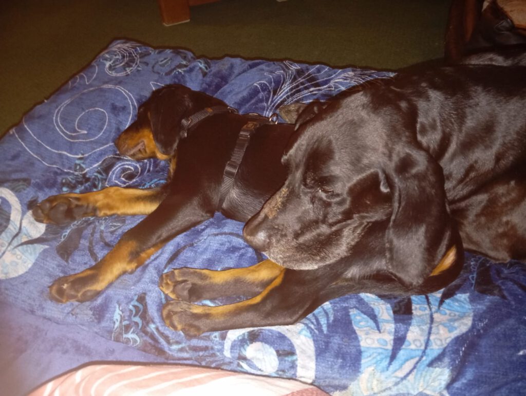 Das war im September 2024 – unser erster Kontakt und später kam Mike fast täglich mich besuchen und im November auch mal mitzunehmen zu Wilson, seinem großen Hund. Wilson war zu dem Zeitpunkt leider krank und wollte nicht viel von mir wissen. Aber Minuten vor seinem Tod krabbelte er zu mir und segnete mich und übergab mir die Verantwortung für Mike & Familie. Sekunden nach dem folgendem Foto brach er tot zusammen.